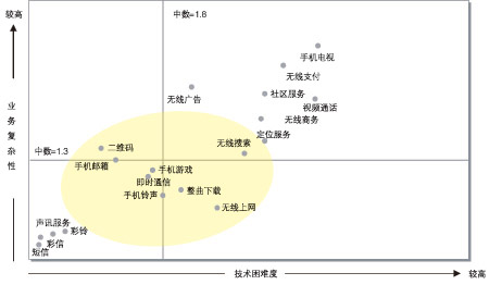 諾基亞西門(mén)子通信借鑒國(guó)外的無(wú)限增值業(yè)務(wù)經(jīng)驗(yàn)和對(duì)國(guó)內(nèi)運(yùn)營(yíng)商業(yè)務(wù)的分析提出“技術(shù)困難度—業(yè)務(wù)復(fù)雜性”模型來(lái)詮釋無(wú)線增值業(yè)務(wù)。