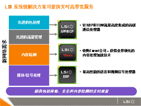 目前,只有很少的技術專家能夠向移動運營商提供推出這些新服務所需要的世界級解決方案。因為這需要技術提供者在通信網絡領域有著深厚的專業(yè)精深技能和高度的系統(tǒng)級解決方案能力。在通信帶寬和實時業(yè)務提供及系統(tǒng)靈活性存在矛盾時,系統(tǒng)設計的挑戰(zhàn)變得至關緊要。 在其他廠商為解決其中任何之一的技術問題而忙碌的時候,世界上有哪個公司可以利用系統(tǒng)的通信處理器綜合設計(包括通信1-7層)將帶寬,實時和靈活性三者完美結合,他便是最終的贏家。LSI就是這些少數(shù)技術專家之一。它能提供一整套解決方案來提供實時高帶寬服務,包括高級網絡通信處理器、內容檢測技術和DSP技術。