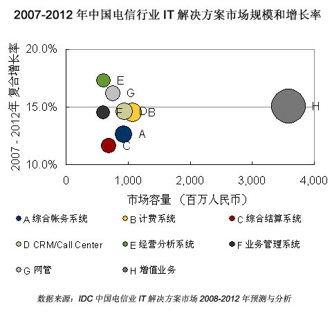 IDC預計,2007-2012年電信行業(yè)將注重運營支撐系統(tǒng)的全業(yè)務運營整合和支持前端業(yè)務,因此3G增值業(yè)務、經(jīng)營分析系統(tǒng)、客戶關系管理系統(tǒng)、IT服務管理系統(tǒng)等建設將實現(xiàn)快速增長。已有項目仍然會持續(xù)升級維護,以及配合全業(yè)務運營作出功能上的提升。2007年電信IT應用解決方案(僅含解決方案供應商自有軟件及其相關服務包括BSS/OSS/MSS/VAS)市場規(guī)模為97.27億元人民幣,占整體電信軟件和服務市場容量的74.5%。2012年電信行業(yè)IT解決方案整體市場規(guī)模將達到193.5億元人民幣。