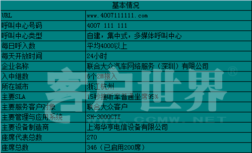 2007年秋天,聯(lián)合大眾汽車網(wǎng)絡(luò)服務(wù)(深圳)有限公司現(xiàn)代化、智能化的大型全國電話呼叫中心落成并投入使用。從投入使用至今,呼叫中心經(jīng)歷了從無到有、不完善到健全的發(fā)展歷程,聯(lián)合大眾24小時(shí)全國服務(wù)熱線現(xiàn)已成為客戶價(jià)值與公司價(jià)值之間傳遞的橋梁。