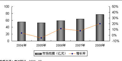 圖1 2004-2008年中國電信運營支撐系統(tǒng)市場規(guī)模及增長