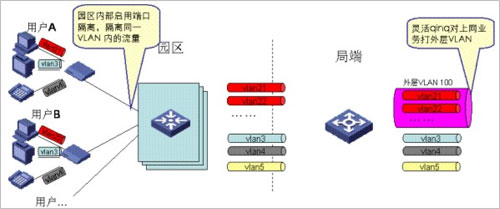 考慮到業(yè)務(wù)特性,上網(wǎng)業(yè)務(wù)通常需要對用戶進(jìn)行精細(xì)化管理,而對IPTV業(yè)務(wù)通常采用較粗獷的管理模式,因此我們建議通過如下方式來做VLAN規(guī)劃:對上網(wǎng)業(yè)務(wù),采用PUPV(每用戶一VLAN),對于IPTV/VOIP業(yè)務(wù),采用PSPV(每業(yè)務(wù)一VLAN),即同一園區(qū)內(nèi)的IPTV用戶采用同一VLAN,不同園區(qū)的IPTV/VOIP用戶采用不同的業(yè)務(wù)VLAN,在局端,通過靈活QINQ對上網(wǎng)業(yè)務(wù)的VLAN打外層標(biāo)簽,對于IPTV業(yè)務(wù)的VLAN不打外層標(biāo)簽。