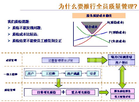 全員質(zhì)量管理的方法還是有一個插曲,第一個為什么要引進(jìn)全員質(zhì)量管理?實(shí)際上我們的企業(yè),作為呼叫中心來說,都有質(zhì)檢的人員,質(zhì)檢的人員好像從來不會出錯。因?yàn)槭裁茨兀恳驗(yàn)樗麖膩聿粫鎸τ脩舻碾娫,而出錯的永遠(yuǎn)是一線的工程師。那出了問題以后,質(zhì)檢人員就會說你出了問題,特別是當(dāng)投訴發(fā)生了以后,每個人都會直接去追查一線工程師的能力,他服務(wù)的質(zhì)量,沒有人去追查我們的質(zhì)檢人員,所以說我有個體會,因?yàn)橛幸淮挝覀兊囊粋同事,可能在跟用戶做電話交流的時候,發(fā)生了不愉快,用戶可能特別生氣,就比較臟的字罵了我們的同事。我們的同事可能感到心理特不平衡,回到家以后睡不著覺,馬上打電話罵這個用戶,那這個用戶很快就投訴過來,出現(xiàn)了這個問題以后,按照以前的方法,我們很快就要跟這個同事解除合同,因?yàn)楦杏X到太嚴(yán)厲了。但是我們現(xiàn)在就想這個同事出現(xiàn)這個問題,為什么我們質(zhì)檢的人員沒有發(fā)現(xiàn)它?所以通過這個方面感覺到,我們不但要去實(shí)時地監(jiān)控我們一線的工程師,而且我們還要提高質(zhì)檢人員的能力,讓我們的質(zhì)檢人員來推廣我們?nèi)珕T的質(zhì)量管理。