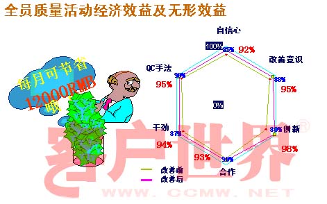 剛才說的全面質(zhì)量管理的話,實(shí)際上除了提高員工發(fā)現(xiàn)問題、解決問題的能力以后,還有很多的收益,包括員工的自信心,改善問題的意識,創(chuàng)新的意識,合作的意識,還有他工作的熱情,還有QC的手法,可以看到我們自己也做了一個內(nèi)部調(diào)查,在改善前和改善后,我們整體的七個隱性、無形的資產(chǎn)都得到了一個很好的提升。