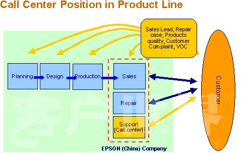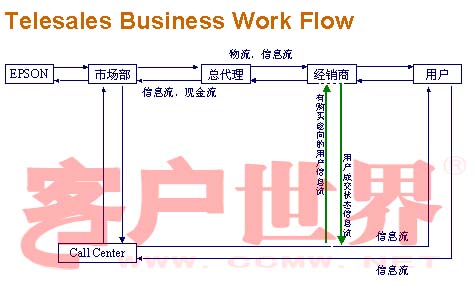 第一個就是我們的電話銷售,可以看到在開展這個電話銷售之前,愛普生所有的銷售都是渠道銷售,渠道銷售的特點(diǎn)是什么呢?就是所有的產(chǎn)品從愛普生,到我們的總代理,到我們的經(jīng)銷商,很多種渠道,然后到我們的用戶,所有的信息流、現(xiàn)金流是這么傳遞,那我們的物流也是相反的方向去傳遞。那有了電話銷售以后,大家可以看到,整個愛普生和我們的用戶之間大大縮短了距離,所有的用戶跟我們市場部門,通過呼叫中心是緊密地把它結(jié)合在一起。以前用戶的銷售信息如果傳遞到我們的總部的話,可以看到每一層傳遞都是有損失的,這么多的傳遞,最后傳遞到公司的話,你這個信息已經(jīng)是有很大的變化,現(xiàn)在通過這個Telesales,把用戶跟我們的總部結(jié)合在一起,我們也加強(qiáng)了跟用戶的溝通,購買的意向都是把它提供到我們的經(jīng)銷商,由經(jīng)銷商及時地把這個產(chǎn)品成交的信息反饋到呼叫中心。