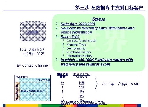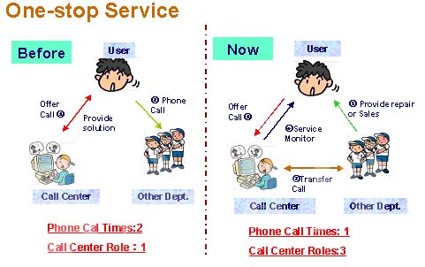 第一個,我們利用這個信息改善了我們的服務(wù),第一個服務(wù)大家都知道,叫做一站式服務(wù)。我估計大家根本沒有我理解的透徹,一開始我們沒有推廣一站式服務(wù)之前,那我們的用戶有問題的話,打電話直接到我們的呼叫中心,假如說你要買一臺打印機(jī),我就說你是北京的用戶,給你提供一個電話就可以了,用戶就會打一個電話再去找我們的經(jīng)銷商,經(jīng)銷商會完成一個銷售?梢钥吹竭@個時候的呼叫中心,每一個請求用戶至少要打兩次電話,而我們呼叫中心的角色就是提供了一個信息。我們開展了這個一站式服務(wù)以后,用戶同樣要買一臺打印機(jī),用戶跟我們的呼叫中心取得聯(lián)系,那我們的呼叫中心通過我們內(nèi)部的系統(tǒng),傳遞到相關(guān)的部門,相關(guān)的部門來提供上門的維修或者上門的銷售,整個的請求結(jié)束了,那整個服務(wù)的監(jiān)控都是通過我們的呼叫中心監(jiān)控,可以看到同樣一個事情,那呼叫中心前后兩種角色的變化,第一同樣一個請求,用戶只需要打一個電話,而整個呼叫中心的角色是三種角色,第一種角色是信息的提供,第二種角色信息的傳遞和共享,第三種角色就是服務(wù)的監(jiān)控,所以可以看到通過一站式服務(wù),來豐富了呼叫中心工作的內(nèi)容,同時才有了我們下面要開展用戶信息的最大化利用。