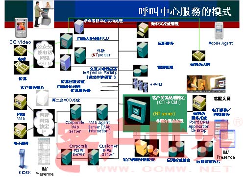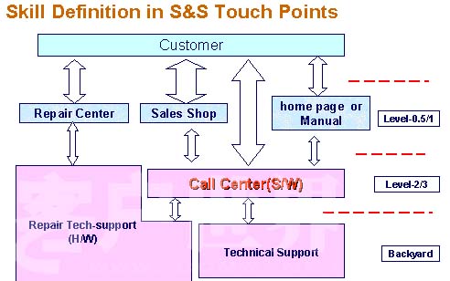 但是作為呼叫中心來說的話,畢竟人力的成本,還是人力的要求一定不同于這些其它部門的技能要求,大家可以看到,對于服務(wù)中心、店面,還有我們的手冊,它技術(shù)的定位實(shí)際上定位到Level0.5—1,也就是我們的呼叫中心在它的窗口里面,整個呼叫中心的定位是高于服務(wù)中心、店面和手冊的。對于呼叫中心來說是作為后臺,也就是說如果用戶出現(xiàn)了問題以后,希望用戶去閱讀我們的手冊,去尋找我們的服務(wù)中心,去尋找我們的店面,再有問題的話,也可以直接通過我們的呼叫中心進(jìn)行了解。通過這個圖的話,實(shí)際上使你感覺到你的呼叫中心在很多的窗口里面,它的定位是不同的。舉個例子來說,移動集團(tuán)都有一個10086的呼叫中心,實(shí)際上還有很多的店面,它的營業(yè)廳,那對于呼叫中心來說,公司有沒有定位,營業(yè)廳的營業(yè)人員,技術(shù)的定位在什么地方?與10086的技術(shù)定位到底有沒有區(qū)別?實(shí)際上弄清楚以后,如果解決不了問題的話,怎么升級的一個過程。剛才這個圖是在整個公司的集團(tuán)里面去定義呼叫中心的一個定義。