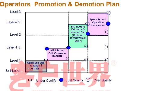 下面一個我還是對呼叫中心本身來說,上一頁的內(nèi)容是在整個公司的集團(tuán)里面怎么去定義呼叫中心人員的技術(shù)定位。那對于呼叫中心本身來說,實(shí)際上也不是所有的工程師和座席服務(wù)代表他的技能都是一樣的,可以看到不同的座席服務(wù)代表他的定義是不一樣的,從Level1到Level3,對每一個階段的員工來說,都有一個被提升的空間。同時作為高一級的座席服務(wù)代表,如果他的表現(xiàn)不好的話,也都有被降格的路徑,所以說這樣的話,就兩條路比較公平,比較公正。