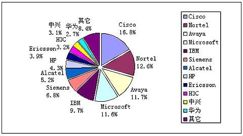 賽迪顧問預(yù)測,2009年中國統(tǒng)一通信市場中,在通信設(shè)備領(lǐng)域,Cisco市場份額將達(dá)到16.8%,繼續(xù)保持領(lǐng)頭樣的位置,而且市場份額有望繼續(xù)增加,Nortel和Avaya緊隨其后,市場份額分別將達(dá)到12.6%和11.7%。而在軟件廠商方面,Microsoft和IBM將繼續(xù)保持市場領(lǐng)先地位,市場份額分別將達(dá)到11.6%和9.7%,增長勢頭強(qiáng)勁。其它市場份額較大的國外統(tǒng)一通信廠商還有西門子、阿爾卡特、愛立信、HP等。在國內(nèi)方面,中興和H3C分別以約3%的市場份額占據(jù)領(lǐng)先位置。