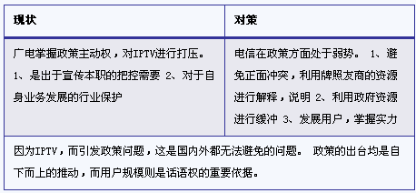 IPTV目前遇到的廣電阻力,主要源于和廣電有線網(wǎng)絡(luò)公司所推進(jìn)的數(shù)字電視的業(yè)務(wù)競(jìng)爭(zhēng),而有線網(wǎng)絡(luò)通過和廣電局的關(guān)聯(lián)關(guān)系,引發(fā)IPTV政策干擾和內(nèi)容屏蔽。