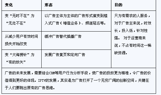 IPTV在短期內(nèi)的屬性還著重于電視媒體,在收入上偏向于后向媒體模式,通過用戶的流量來帶動(dòng)后向廣告價(jià)值。借助IPTV的互動(dòng)特性和頻道資源的豐富性,以空間來換取稀缺的時(shí)間資源。