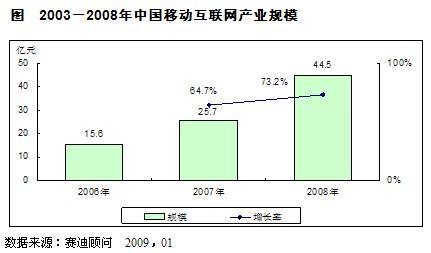 2008年中國移動(dòng)互聯(lián)網(wǎng)產(chǎn)業(yè)以73.2%的高速增長,實(shí)現(xiàn)了44.5億元的收入規(guī)模。