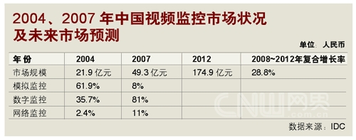 IDC的數(shù)字同樣樂觀。跟據(jù)IDC在2008年的預測,2008~2012年,中國視頻監(jiān)控市場的年均復合增長率將達28.8%,遠高于IT市場投入的平均增長率。而在模擬、數(shù)字與IP模式(即網(wǎng)絡監(jiān)控)組成的視頻監(jiān)控市場里,IP的增長率又將高于前二者,成為市場增長的強勁動力!保ㄗⅲ耗M監(jiān)控是指圖像信號在采集后,通過模擬信號傳輸?shù)姆忾]式視頻監(jiān)控系統(tǒng)模式;數(shù)字監(jiān)控是指圖像信號在采集后,經(jīng)過編碼轉(zhuǎn)化成數(shù)字信號再進行傳輸?shù)姆忾]或半封閉式視頻監(jiān)控系統(tǒng)模式;網(wǎng)絡監(jiān)控是指系統(tǒng)建立在以網(wǎng)絡為基礎的傳輸平臺的開放式視頻監(jiān)控系統(tǒng)模式)。