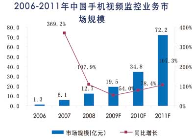 根據(jù)諾達咨詢《手機視頻監(jiān)控市場及用戶行為研究報告2009》研究結果,2006-2009年為手機監(jiān)控業(yè)務導入期,2006年手機監(jiān)控業(yè)務市場規(guī)模達到1.3億人民幣,手機監(jiān)控業(yè)務的年運營費用自2009年開始,將會逐步下降,目前平均約1000元/年,至2011年將逐步下降到600元/年,設備費用也將由目前的3000元/點,逐步下降到2011年的1000元/點。