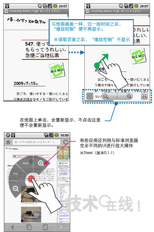 圖片說明: 利用不同操作調(diào)出同一工具為在Android的標(biāo)準(zhǔn)瀏覽器(上面的兩個(gè)畫面)上調(diào)出縮放畫面顯示的工具(縮放控制),用手指拖拽畫面(向一個(gè)方面滑動(dòng))。為利用地圖應(yīng)用軟件調(diào)出同一工具,需要輕敲畫面(敲擊)能從在Android市場上下載的瀏覽器(下面的畫面)有能夠利用完全不同的UI縮放畫面的工具。