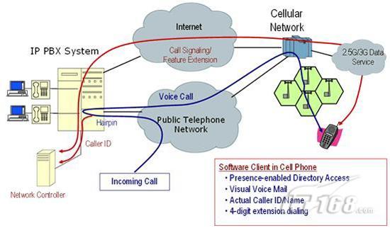 Sprint-Nextel最近推出了一種運(yùn)用Femtocells技術(shù)、類(lèi)似cFMC的解決方案,稱(chēng)為Airave。按照這個(gè)方案,用戶(hù)把蜂窩通信網(wǎng)絡(luò)的一個(gè)小型基站同基地的寬帶互聯(lián)網(wǎng)連接在一起。如圖1所示,這兩種方案都是利用寬帶互聯(lián)網(wǎng)和蜂窩通信網(wǎng)絡(luò)其中之一實(shí)現(xiàn)Voip,不同的區(qū)別只是本地的無(wú)線(xiàn)連接是運(yùn)用Wi-Fi技術(shù)還是蜂窩通信網(wǎng)絡(luò)。對(duì)企業(yè)用戶(hù)而言,主要缺點(diǎn)是,這兩種實(shí)現(xiàn)方式提供的都是由用戶(hù)主導(dǎo)的單一語(yǔ)音服務(wù),而沒(méi)有面向企業(yè)PBX或移動(dòng)UC系統(tǒng)的接口。