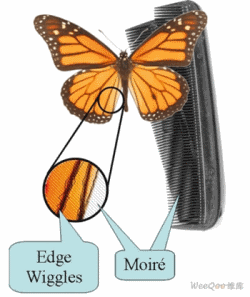 為了反映鏡像邊帶沒有衰減的效果,圖3b和3c示意了奈奎斯特頻率和時鐘頻率處的頻譜重疊。這些疊加的鏡像邊帶信號(圖3d)與視頻信號相比具有隨機的相位差。圖4表示我們需要避免的圖像誤差。“邊緣擺動”是高頻邊緣干擾,它重疊在視頻信號上,具有隨機變化的相位。摩爾效應是時鐘、視頻信號頻率之間相互作用的結(jié)果。
