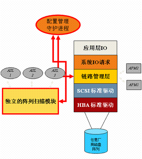 該技術的特點是通過主機層軟件方式建立存儲管理虛擬層,利用專業(yè)的第三方鏈路管理軟件解決磁盤陣列和主機的連通兼容性。其運行依靠工作在存儲網(wǎng)絡鏈路管理層的軟件程序來完成,其體系架構圖如下: