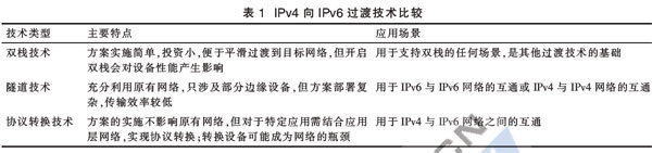目前,主要的過渡技術有雙棧技術、隧道技術和協(xié)議轉換技術等。雙棧技術就是在設備上同時安裝IPv4和IPv6協(xié)議棧,應用程序根據(jù)DNS解析地址類型選擇使用IPv6或IPv4;隧道技術有多種實現(xiàn)方式,主要將IPv6報文作為IPv4的凈荷,實現(xiàn)IPv6孤島之間的互聯(lián),或者以相反方式實現(xiàn)IPv4孤島之間的互聯(lián);協(xié)議轉換技術通常應用在IPv6和IPv4網絡的交界處,實現(xiàn)IPv6主機與IPv4主機之間的互通。