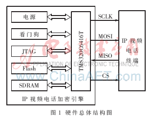 加密引擎以TMS320C6416T為核心,包括SDRAM、Flash、電源、JTAG接口、看門狗等。加密引擎和IP視頻電話終端通過(guò)SPI總線通信,硬件總體結(jié)構(gòu)如圖1所示。