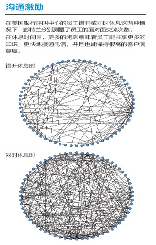 去年,彭特蘭的實(shí)驗(yàn)室與美國(guó)銀行(Bank of America)設(shè)在羅得島(Rhode Island)的呼叫中心合作,在80 名中心員工身上安裝了社會(huì)傳感器。這種傳感器看起來(lái)像一枚不顯眼的徽章,使用藍(lán)牙和紅外信號(hào)監(jiān)測(cè)實(shí)驗(yàn)對(duì)象每分鐘與哪些同事交談。測(cè)試活動(dòng)先開展了一個(gè)月,后來(lái)又進(jìn)行了6周。第一個(gè)月后,實(shí)驗(yàn)室的研究人員發(fā)現(xiàn),與更多同事進(jìn)行過交談的員工能夠更快地接通電話,他們自我感覺的壓力也相對(duì)較小,而客戶滿意度卻與其他人一樣高。與刻板地遵循員工手冊(cè)或服從經(jīng)理的電子郵件指示相比,通過非正式的閑聊來(lái)交流問題和解決方案似乎能取得更好的結(jié)果。有了這種結(jié)論之后,該呼叫中心嘗試盡量將員工的休息時(shí)間安排在一起,而非像過去那樣錯(cuò)開。這樣員工就有了更多的時(shí)間參與閑聊。幾個(gè)月后,美國(guó)銀行向?qū)嶒?yàn)室報(bào)告了結(jié)果:該呼叫中心獲得了相當(dāng)于每年1,500 萬(wàn)美元的生產(chǎn)力提升。