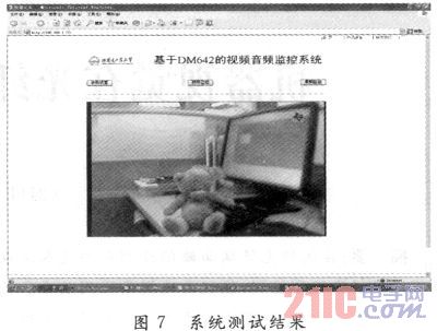 在集成開發(fā)環(huán)境CCS(C6000)下,加載相關(guān)驅(qū)動程序,對本系統(tǒng)進行了測試。CCD攝像頭為標準PAL制式,圖像采集的幀頻為25幀/s,圖像的分辨率為720×576像素。測試結(jié)果如圖7所示。測試結(jié)果表明,網(wǎng)絡(luò)連接正常,用戶在PC端可通過瀏覽器訪問系統(tǒng),成功實現(xiàn)遠程監(jiān)控。