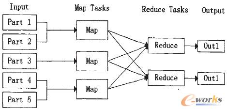 作為云計算的核心,簡單來講Map Reduce就是“任務(wù)的分解與結(jié)果的匯總”,圖3是其工作模式示意圖。