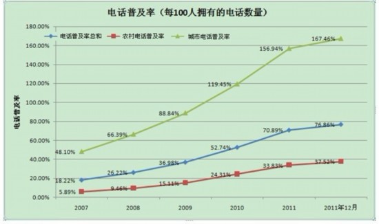 城市電話普及率從2007年3月的48.10%,增長到2011年3月的156.94%,到2011年12月底達(dá)到167.46%。