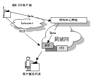 國(guó)際上一些先進(jìn)的 呼叫中心產(chǎn)品供應(yīng)商現(xiàn)在已經(jīng)把 Web 技術(shù)引入到他們的產(chǎn)品中了。通過屏幕上的一個(gè)按鈕可以利用 Internet 電話把客戶和呼叫中心連接起來?蛻羰褂靡粋(gè)很普通的帶有麥克風(fēng)﹑聲卡以及傳輸速率不小于 28.8 kbps 的Modem 的多媒體 PC 機(jī),并配有 Web 瀏覽器以及與 H.323兼容的應(yīng)用軟件就可以利用把他們連接到 Web 站點(diǎn)的那條電話線與呼叫中心的座席員交談。其簡(jiǎn)單示意圖如下: