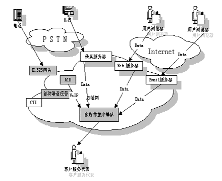 多媒體呼叫中心實(shí)際上是基于CTI 技術(shù)的傳統(tǒng)呼叫中心與 ICC 的相互結(jié)合,F(xiàn)在許多呼叫中心把各種媒體通信技術(shù)集成到了一起,允許座席員同時(shí)可以處理語音呼叫﹑Web請(qǐng)求﹑e-mail和傳真。其簡(jiǎn)單示意圖如下: