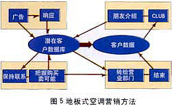 ——銷售支持:東京煤氣公司擁有三種主要的家用產(chǎn)品:地板式空調(diào),煤氣暖氣及煤氣衣服干燥機(jī)。此公司于1993年開始運(yùn)用數(shù)據(jù)庫營銷,現(xiàn)已取得了驕人的成果。其中主力產(chǎn)品——地板式空調(diào),盡管周期長、價(jià)格高,1997年一年就銷售了3萬6千套,同時(shí)從對這些用戶調(diào)查的結(jié)果發(fā)現(xiàn)“滿意”的占96%。下面介紹一下“地板式空調(diào)”的營銷方法(見圖5)