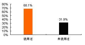 調(diào)查數(shù)據(jù)顯示,在所訪問(wèn)6個(gè)城市的手機(jī)用戶中,已使用過(guò)數(shù)據(jù)增值業(yè)務(wù)(包括已使用過(guò)短信業(yè)務(wù)或已使用過(guò)其它業(yè)務(wù)的)的用戶占總體的68.1%,而還未使用過(guò)數(shù)據(jù)增值業(yè)務(wù)的占總體的31.9%。如下圖所示: