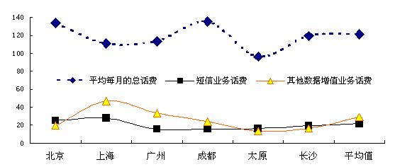 調(diào)查數(shù)據(jù)顯示,在所訪6個(gè)城市的手機(jī)用戶中,過(guò)去三個(gè)月平均每個(gè)月的話費(fèi)總額平均為121.3元(以北京和成都的用戶平均總話費(fèi)較高),其中短信話費(fèi)平均每月為14.0元,而其它數(shù)據(jù)增值業(yè)務(wù)話費(fèi)平均話費(fèi)為4.8元。