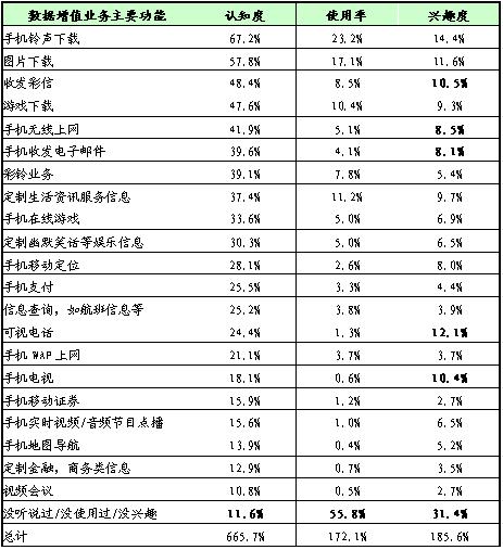 認(rèn)知度:手機(jī)鈴聲下載、圖片下載、收發(fā)彩信、游戲下載、手機(jī)無(wú)線上網(wǎng)、手機(jī)收發(fā)電子郵件、彩鈴業(yè)務(wù)、定制生活資訊服務(wù)信息(新聞、天氣預(yù)報(bào)等)等