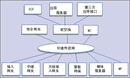 接入層包括各種接入網(wǎng)關、中繼網(wǎng)關、無線接入網(wǎng)關、智能終端以及與處理媒體有關的媒體服務器和多點處理器(MP)。傳送層包括提供IP包轉發(fā)的各種承載網(wǎng)功能實體?刂茖邮荖GN網(wǎng)絡的核心,主要包括軟交換設備、信令網(wǎng)關和多點處理器。業(yè)務層則主要包括應用服務器、第三方應用接口和傳統(tǒng)智能網(wǎng)功能。該業(yè)務層通過開放的業(yè)務層接口向用戶提供傳統(tǒng)智能網(wǎng)業(yè)務、多樣化的第三方業(yè)務和增值業(yè)務。