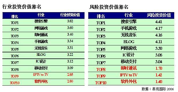 設計行業(yè)將成為半導體行業(yè)風險投資追逐的新星并具有相當?shù)拈L期行業(yè)投資價值。在十個行業(yè)中,IPTV 和軟件外包行業(yè)三年內(nèi)的投資價值最低。