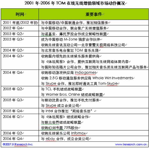 2000年中,TOM在線正式推出,這家一開始便以無線增值為特色的企業(yè)符合了當(dāng)時(shí)中國互聯(lián)網(wǎng)市場的環(huán)境,那時(shí)無線增值業(yè)務(wù)如火如荼,第五媒體的概念呼之欲出。隨后,便開始了與各大無線媒體、傳統(tǒng)媒體等一系列的合作和收購,所涉及的領(lǐng)域涵蓋短信、無線音樂、手機(jī)游戲、手機(jī)支付、手機(jī)體育新聞、即時(shí)通訊等許多行業(yè),一個(gè)龐大的無線媒體帝國看似已經(jīng)牢不可破。直到,2006年第四季度與ebay易趣合并,開始涉足電子商務(wù)。