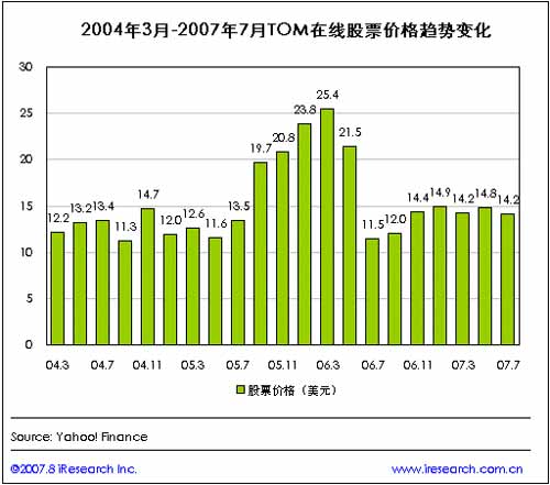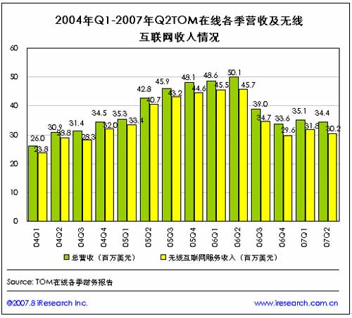 在2006年第二季度總營收以及無線互聯(lián)網(wǎng)服務(wù)收入分別達(dá)到歷史最高點(diǎn)(分別達(dá)到5010萬美元和4571萬美元)之后,TOM在線各季收入及無線互聯(lián)網(wǎng)收入呈逐季下滑趨勢,至2007年第二季度,TOM在線的總營收為3439萬美元,來自無線互聯(lián)網(wǎng)服務(wù)的收入為3024萬美元!
