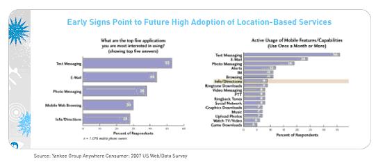 當美國聯(lián)邦通信委員會(FCC)在2001年強制要求實施911增強功能時,移動行業(yè)就開始通過將導航服務引入大眾市場來獲利。7年后,絕大多數(shù)手機都集成了GPS功能,幾大主要的移動運營商也都計劃在年內推出至少一項基于GPS 的導航應用。揚基集團認為,2008年正在成為美位置服務的轉折點。