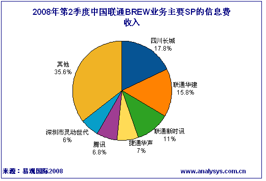 易觀國(guó)際近期發(fā)布《2008年第2季度中國(guó)手機(jī)游戲市場(chǎng)季度監(jiān)測(cè)》顯示:中國(guó)移動(dòng)JAVA業(yè)務(wù)SP信息費(fèi)方面,掌中米格、北京新浪分居前兩名,兩者市場(chǎng)占有率已提高至31.9%。其中掌中米格信息費(fèi)季度收入達(dá)到2505.86萬(wàn)元,市場(chǎng)占比為17.3%,而新浪信息費(fèi)收入市場(chǎng)占比為14.6%。信息費(fèi)收入的第3至第5名依次為T(mén)OM、com2us、掌尚星空,三者總市場(chǎng)占比為9.7%。