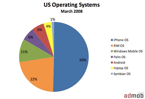 報(bào)告顯示,WindowsMobileDevices的份額從13%下滑至11%;黑莓的RIMOS上升1%,至22%;iPhone則維持50%不變。