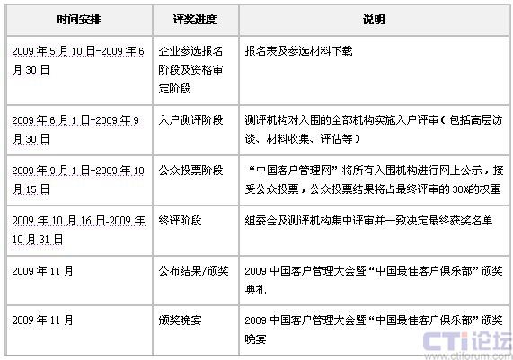 本次評選活動將邀請國內權威客戶管理研究機構“迪銘客戶管理研究院”為唯一測評機構。評選自2009年5月開始,經(jīng)過一系列的評選流程,評選最終結果將于2009年11月在北京舉辦的“2009中國客戶管理大會暨中國最佳客戶俱樂部頒獎典禮”中隆重揭曉。