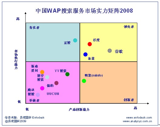 2008年WAP搜索實力矩陣中的創(chuàng)新者為明復,明復在多個領域推廣移動搜索業(yè)務,如攜手SIC共建國家商務數(shù)據(jù)中心,首推無線名址服務,另外還推出尋親移動搜索,奧運手機搜索等。特別地,明復通過和產(chǎn)業(yè)鏈各環(huán)節(jié)的積極合作以及產(chǎn)品及服務的大力推廣,奠定了一定的品牌知名度和用戶認知度。