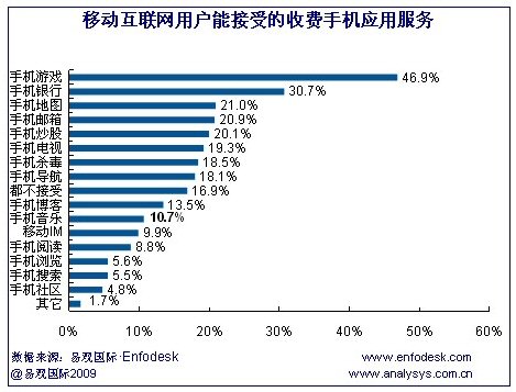 CTI論壇(ctiforum)06月22日消息:據(jù)易觀國際(Analysys International)《中國手機應(yīng)用市場用戶調(diào)研報告2009》研究發(fā)現(xiàn),移動互聯(lián)網(wǎng)用戶可接受收費的應(yīng)用主要是手機游戲和手機銀行/支付,其比例分別為47%和31%,而手機游戲也是移動互聯(lián)網(wǎng)用戶使用比例較高的手機應(yīng)用服務(wù)之一。另外,用戶可接受程度較高的還包括手機郵箱、手機導(dǎo)航、手機炒股、手機電視/視頻以及手機殺毒等應(yīng)用。而移動互聯(lián)網(wǎng)用戶對于手機社區(qū)和手機搜索收費的接受度較低。研究發(fā)現(xiàn),移動互聯(lián)網(wǎng)用戶可接受收費的應(yīng)用主要是手機游戲和手機銀行/支付,其比例分別為47%和31%,而手機游戲也是移動互聯(lián)網(wǎng)用戶使用比例較高的手機應(yīng)用服務(wù)之一。另外,用戶可接受程度較高的還包括手機郵箱、手機導(dǎo)航、手機炒股、手機電視/視頻以及手機殺毒等應(yīng)用。而移動互聯(lián)網(wǎng)用戶對于手機社區(qū)和手機搜索收費的接受度較低。