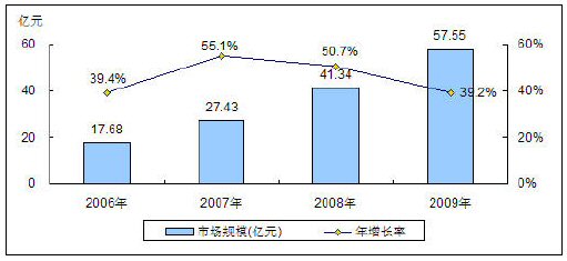 圖: 2006-2009年中國BPO市場(chǎng)規(guī)模與增長(zhǎng)