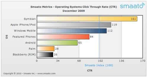 Smaato的數(shù)據(jù)顯示,將所有手機(jī)平臺(tái)的移動(dòng)廣告平均點(diǎn)擊率設(shè)為100分,那么Symbian的得分高達(dá)161分,排名第一,遙遙領(lǐng)先于得分119、排名第二的iPhone,而Android得分僅65。比Android更差的是Palm和黑莓手機(jī)。