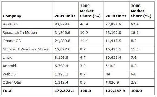 根據(jù)Gartner的數(shù)據(jù)顯示,去年共銷(xiāo)售出的智能手機(jī)達(dá)1.72億部,比前年上漲了24%,然而全世界手機(jī)的銷(xiāo)售總量卻并無(wú)起色(2008年為12.2億部,而2009年為12.1億部。在去年銷(xiāo)售的所有手機(jī)中,智能手機(jī)占14%,較2008(11%)年有所提升。iPhone盡管去年漲勢(shì)迅猛,只占去年各種手機(jī)銷(xiāo)售總量的2%。