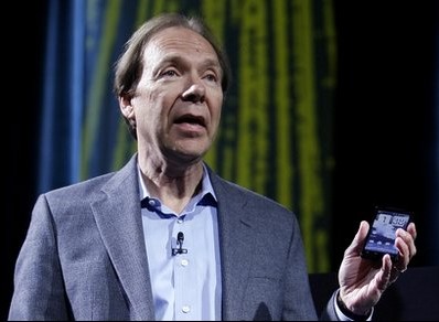 圖:Sprint CEO丹·海斯(Dan Hesse)在美國無線通信展上展示宏達(dá)電新手機(jī)Evo 4G