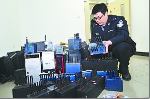 3月23日凌晨5時許,警方兵分五路,一舉搗毀位于西城、石景山、通州等地的5個群發(fā)窩點,抓獲四川籍向某、河南籍徐某等8名嫌疑人,同時繳獲了涉案手機短信群發(fā)器62臺、臺式電腦15臺、筆記本電腦2臺、用于短信群發(fā)的電話卡4000余張。