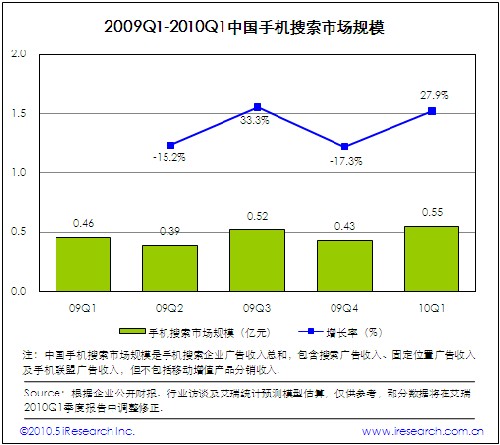 2010Q1中國手機(jī)搜索市場規(guī)模為5500萬,環(huán)比增長27.9%,手機(jī)搜索請求量和PV的大幅增長帶動(dòng)廣告收入增加。自2009年下半年以來,受手機(jī)上網(wǎng)用戶規(guī)模迅速發(fā)展以及用戶活躍度和黏性顯著增加的影響,手機(jī)搜索市場進(jìn)入快速發(fā)展階段。與此同時(shí),手機(jī)搜索企業(yè)紛紛加大市場投入力度,建立與電信運(yùn)營商和手機(jī)終端廠商的深度合作關(guān)系是業(yè)務(wù)拓展的重點(diǎn)方向。此外,網(wǎng)頁產(chǎn)品和客戶端軟件深度整合也是手機(jī)搜索企業(yè)布局移動(dòng)互聯(lián)網(wǎng)市場的最佳實(shí)踐。受谷歌事件影響,艾瑞預(yù)計(jì)2010Q2手機(jī)搜索市場集中度將進(jìn)一步提高。